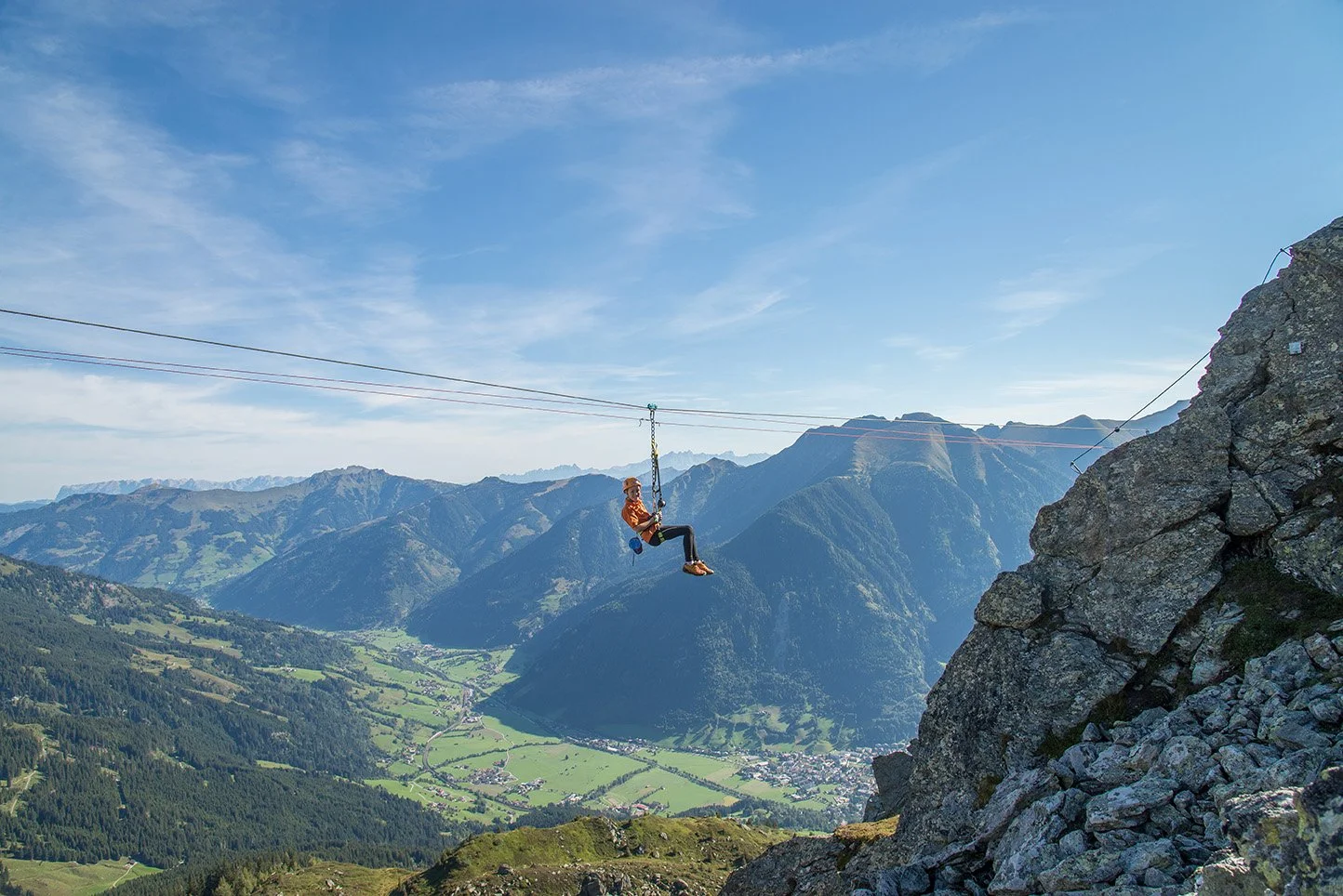 Nestled high above the beautiful valley of Bad Hofgastein in Austria, the via ferrata known as Hirschinger on the Schlossalm ridge offers an exhilarating mix of alpine scrambling, fixed-wire climbing and adventurous features such as suspension bridges and a zip-line. It melds adrenaline with alpine panorama and is equally suited for more experienced climbers as well as adventurous hikers looking to step into the world of via ferrata.