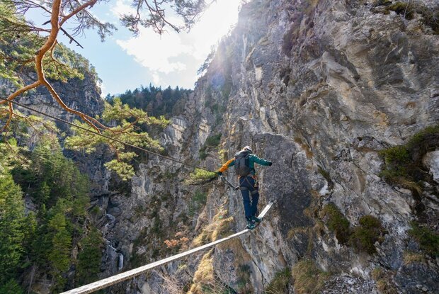 You clip in and follow steel cables along rock faces, traverse exposed sections and cross rope bridges that span the gorge and offer dramatic views into its depths. One of the highlights is termed the “Götterquergang” – a traverse where you look across the three waterfalls of the gorge and out into the valley.