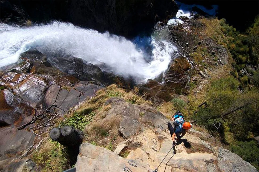 Descent route: After the ferrata finish, descent via marked hiking trail with platforms and steps down beside waterfall—adds scenic value.