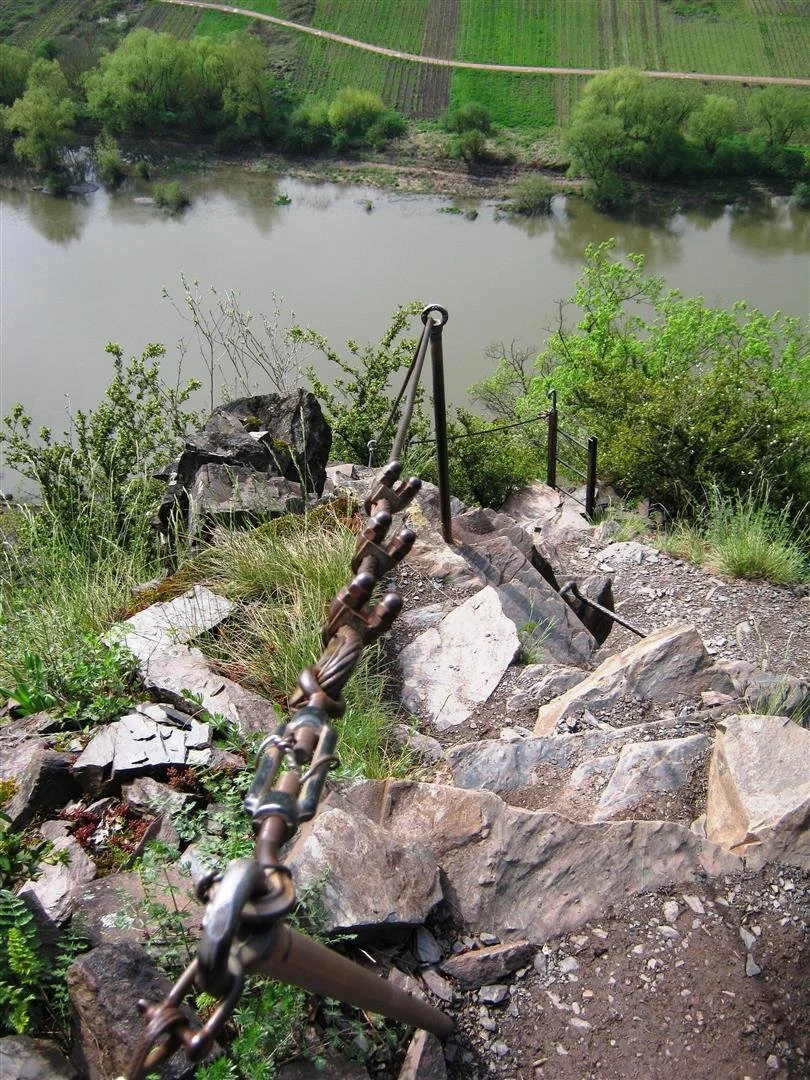 The route begins in Bremm and immediately ascends through terraced vineyards before transitioning onto steeper, rocky terrain. Metal steps, ladders, and fixed steel cables guide hikers across narrow traverses overlooking the sweeping Moselle River bend.