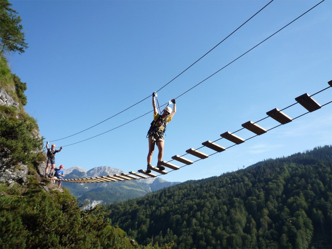 Isidor Route (C): Suitable for athletic beginners who have used via ferrata gear before. Requires basic climbing coordination.