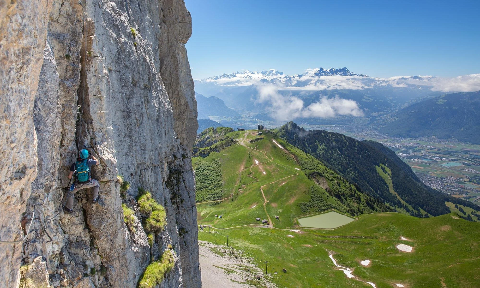 The second half includes more technical climbing, with narrow ledges, short overhanging sections and several ladders fixed directly into the rock. The higher you climb, the more expansive the views become—Lake Geneva, the Vaud Alps, and the jagged peaks above Leysin. The final push leads to the grassy ridge just below the Tour d’Aï summit, where a short walk brings you to the panoramic viewpoint.