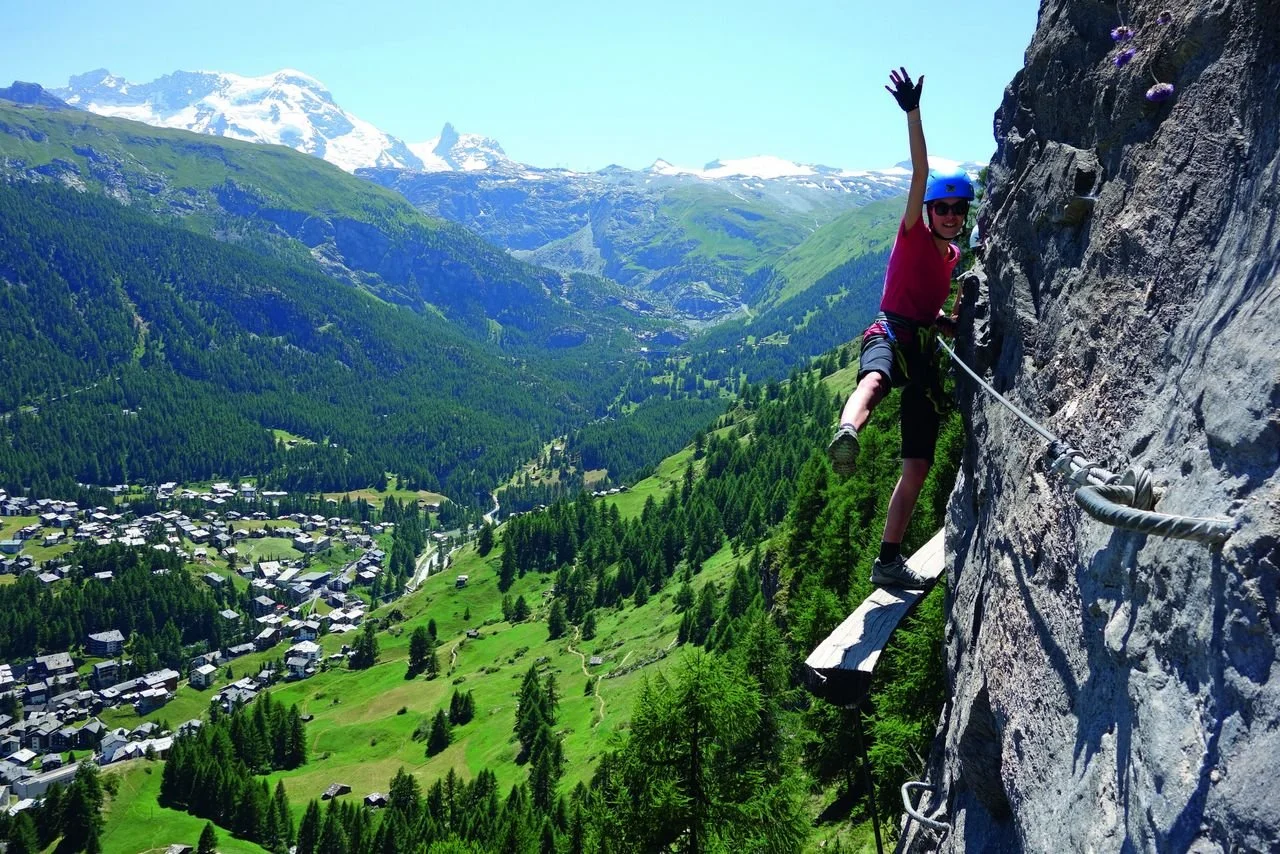 The Via Ferrata Zermatt – Schweifinen is a scenic and accessible fixed-rope route overlooking one of the most iconic mountain villages in the Alps. Positioned above Zermatt’s rooftops, this route combines vertical sections, airy traverses, and panoramic viewpoints of the Matterhorn and surrounding peaks. It is a well-equipped ferrata designed to introduce beginners to vertical terrain while still offering enough exposure to satisfy intermediate climbers seeking an exciting half-day experience.
